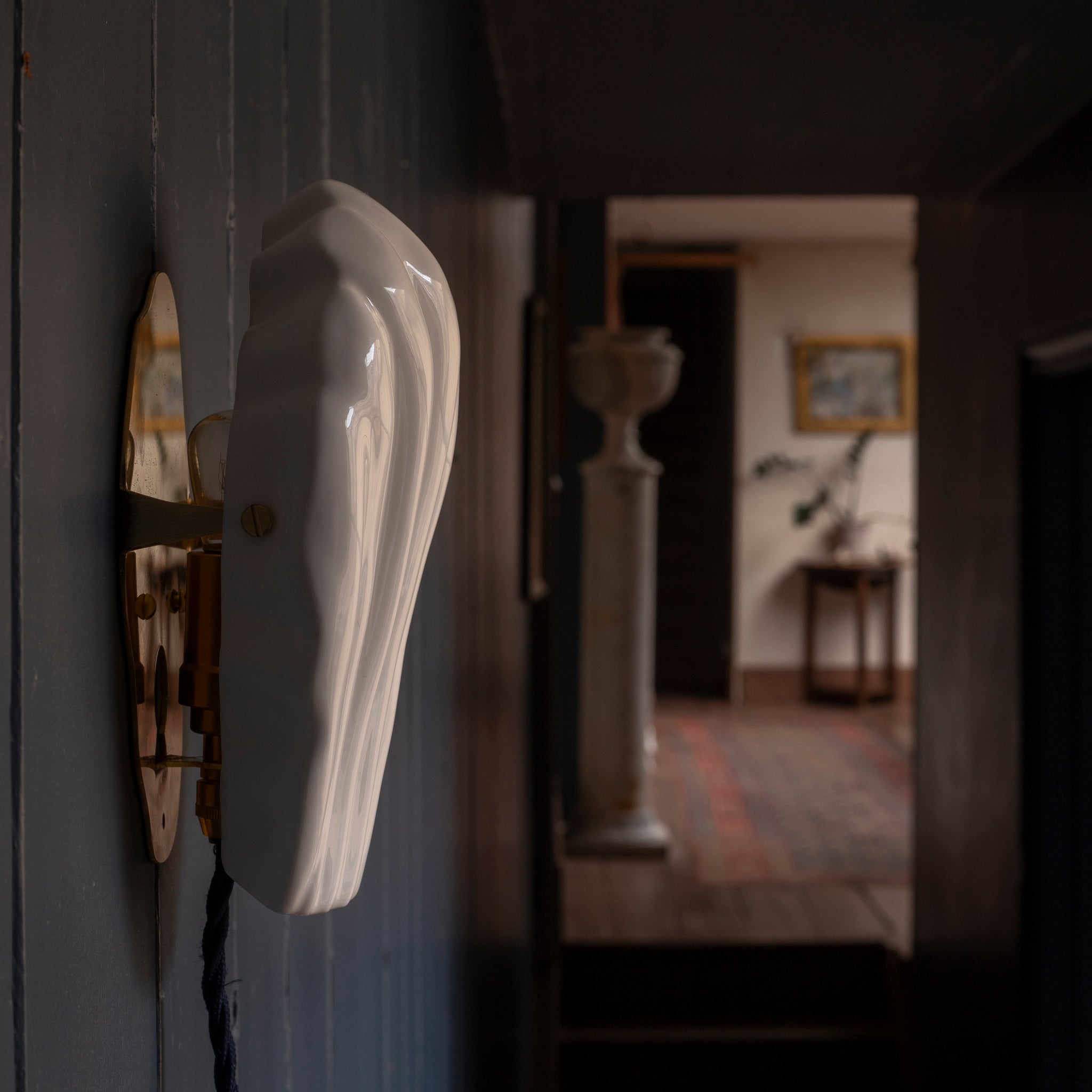 Each piece is slip-cast in fine bone china, finished with their signature translucent glaze, and assembled with precision hand cut brass fittings. It is set slightly off the wall to allow for light to spill out surrounding it.